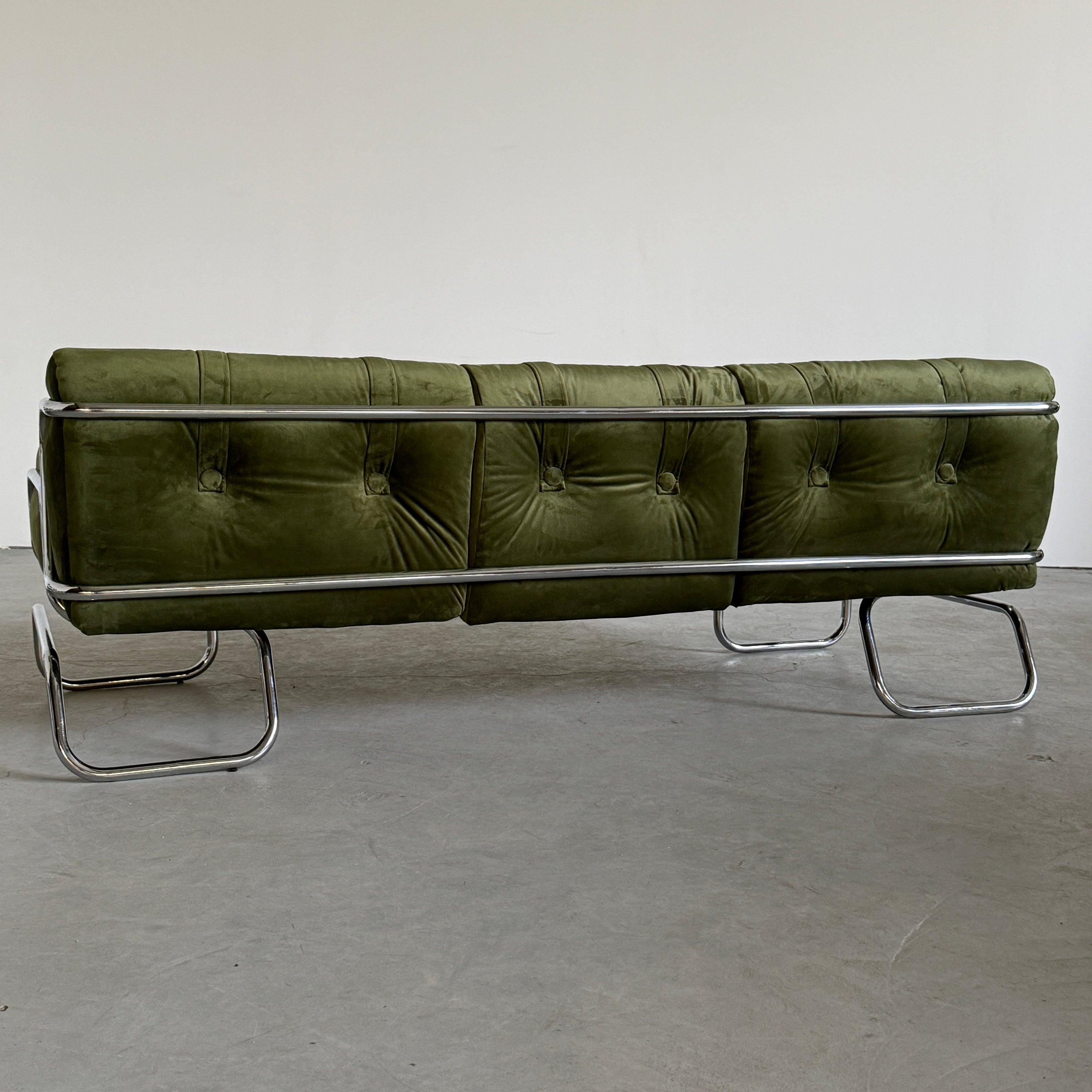 Mid-Century Modern Sofa in Green Velvet and Chromed Tubular SteelSold out